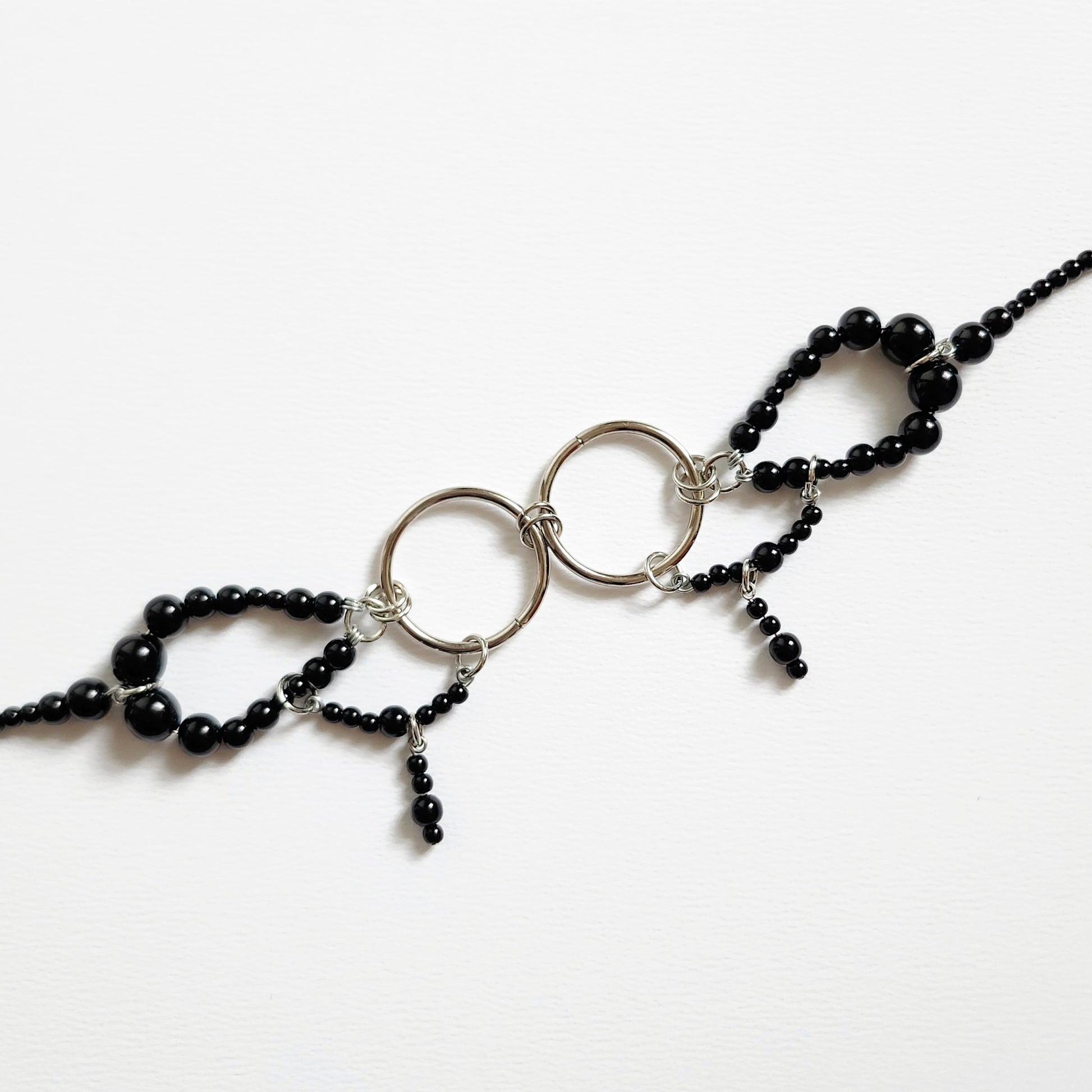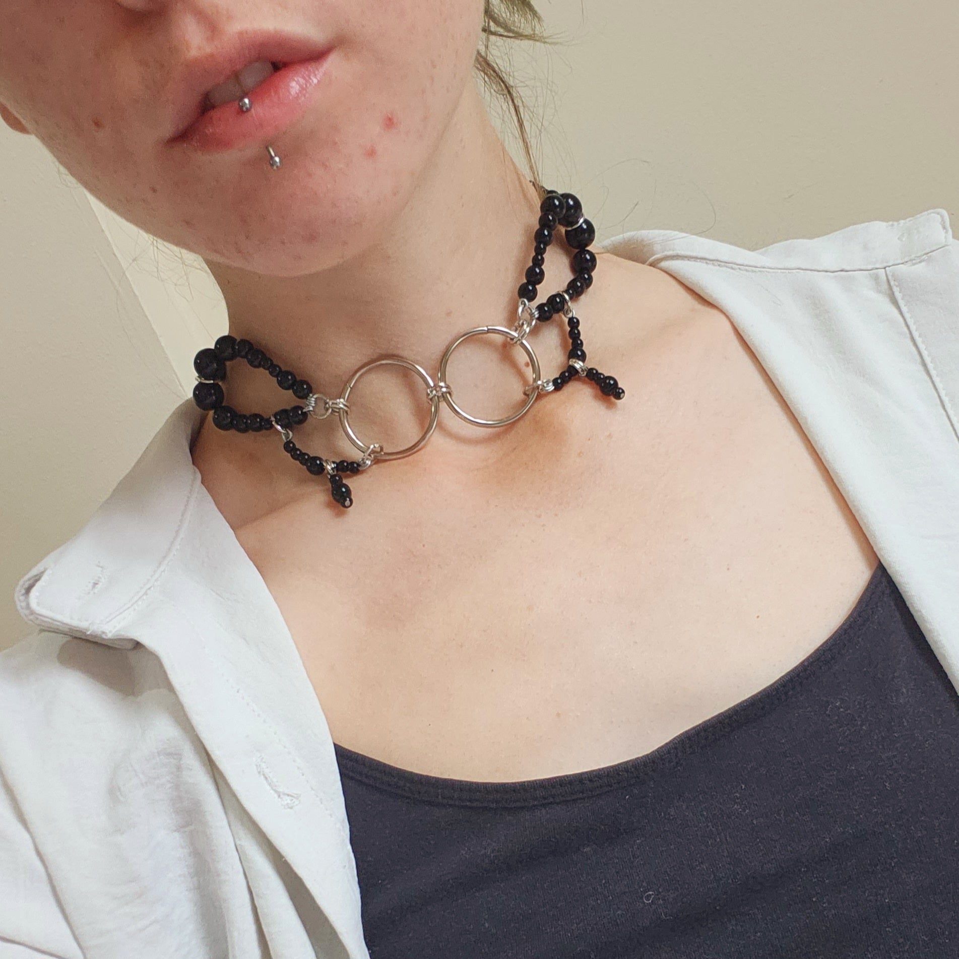 'Love birds' Double ring black collar handbeaded choker - Black beads/silver findings