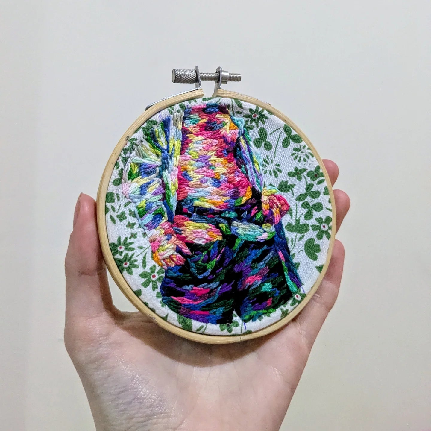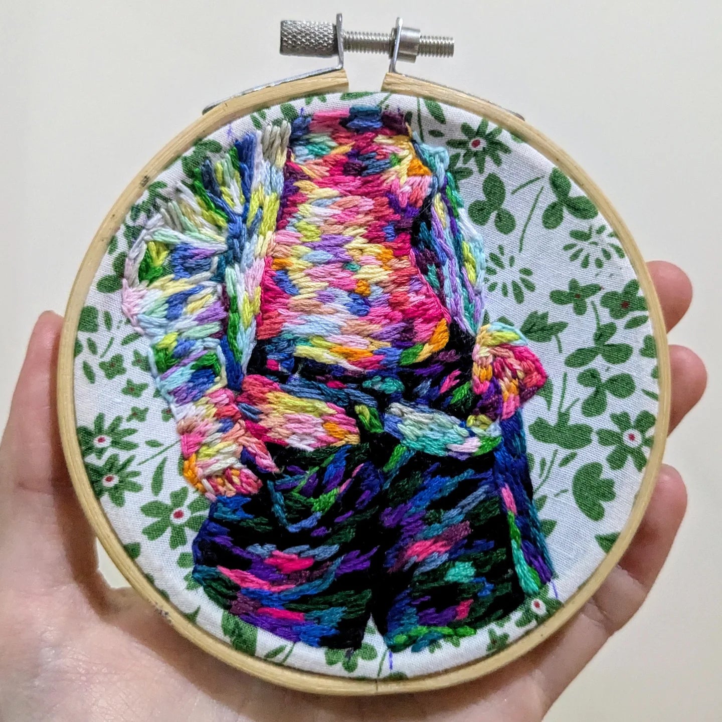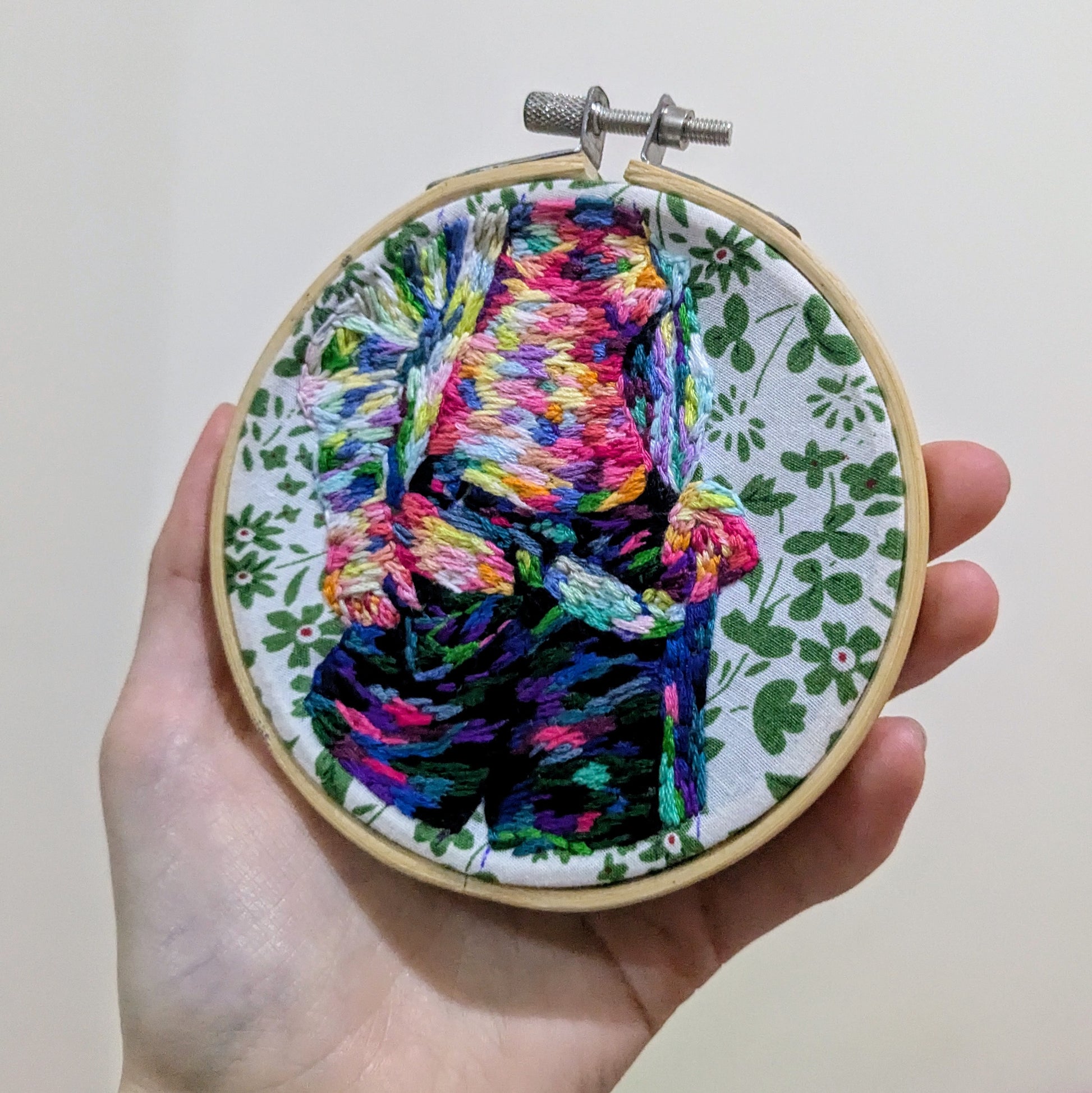Handstitched colourful embroidery. Hoop has a 10.5cm diameter.