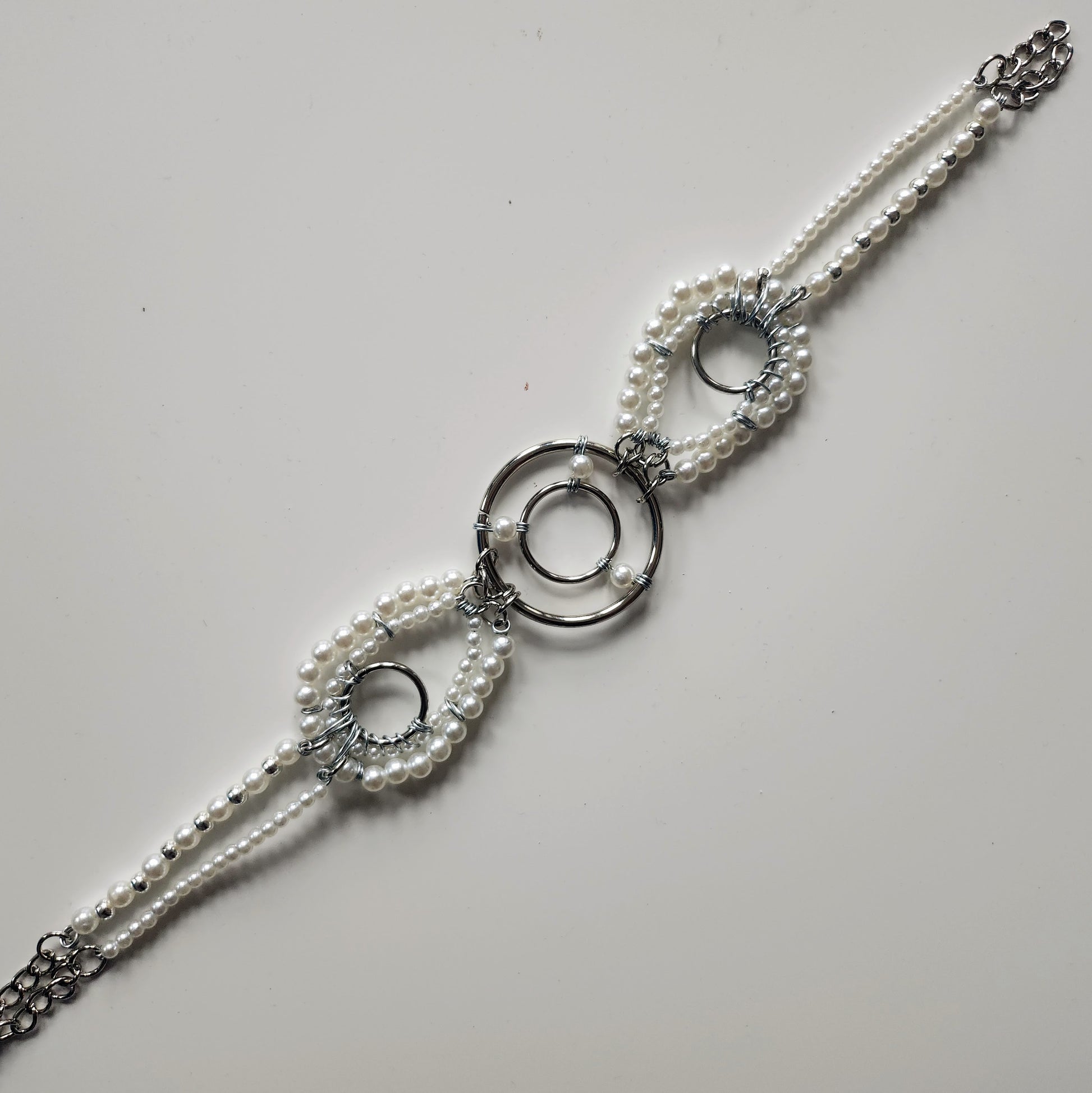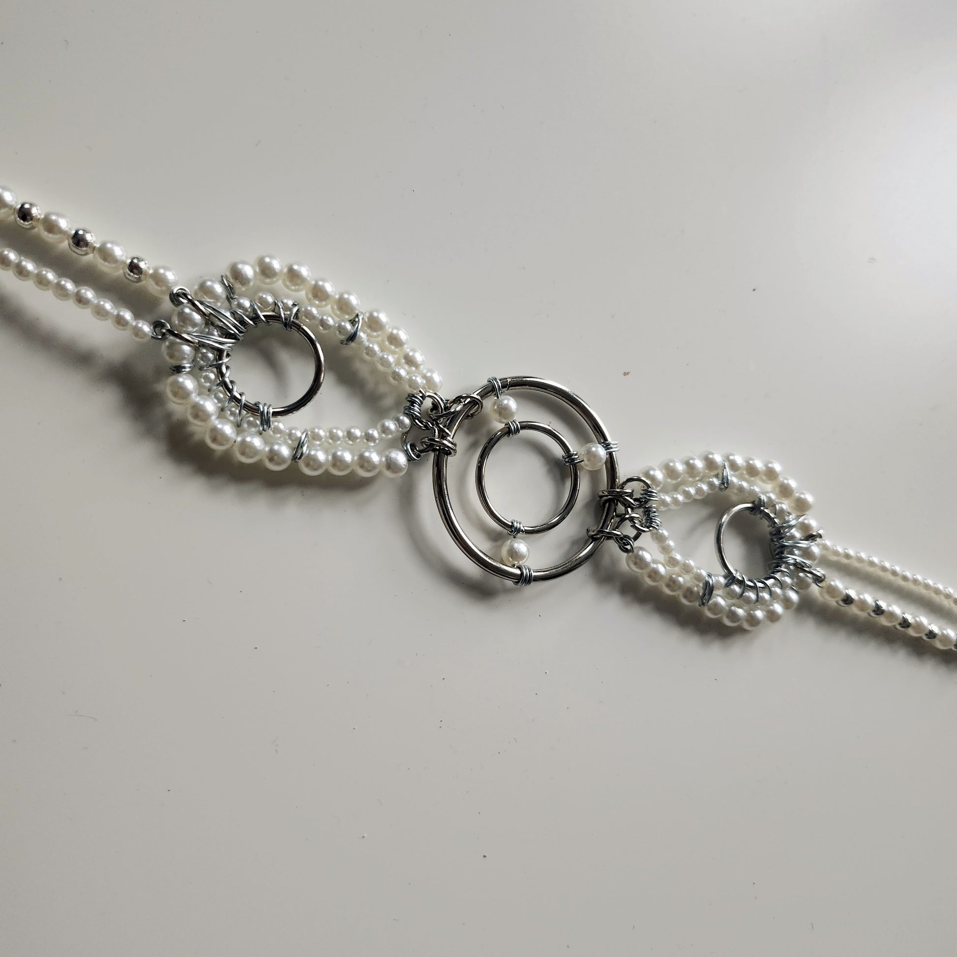 Handbeaded a wired faux Pearl bead collar with silver tone findings.