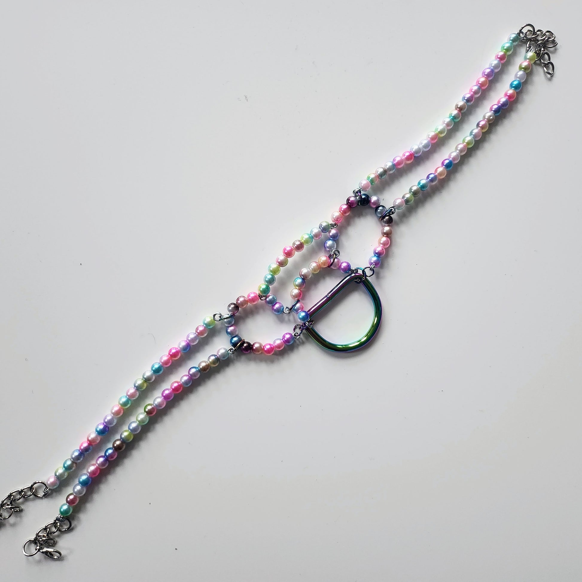 Handbeaded a wired faux Pearl bead collar with rainbow tone findings.