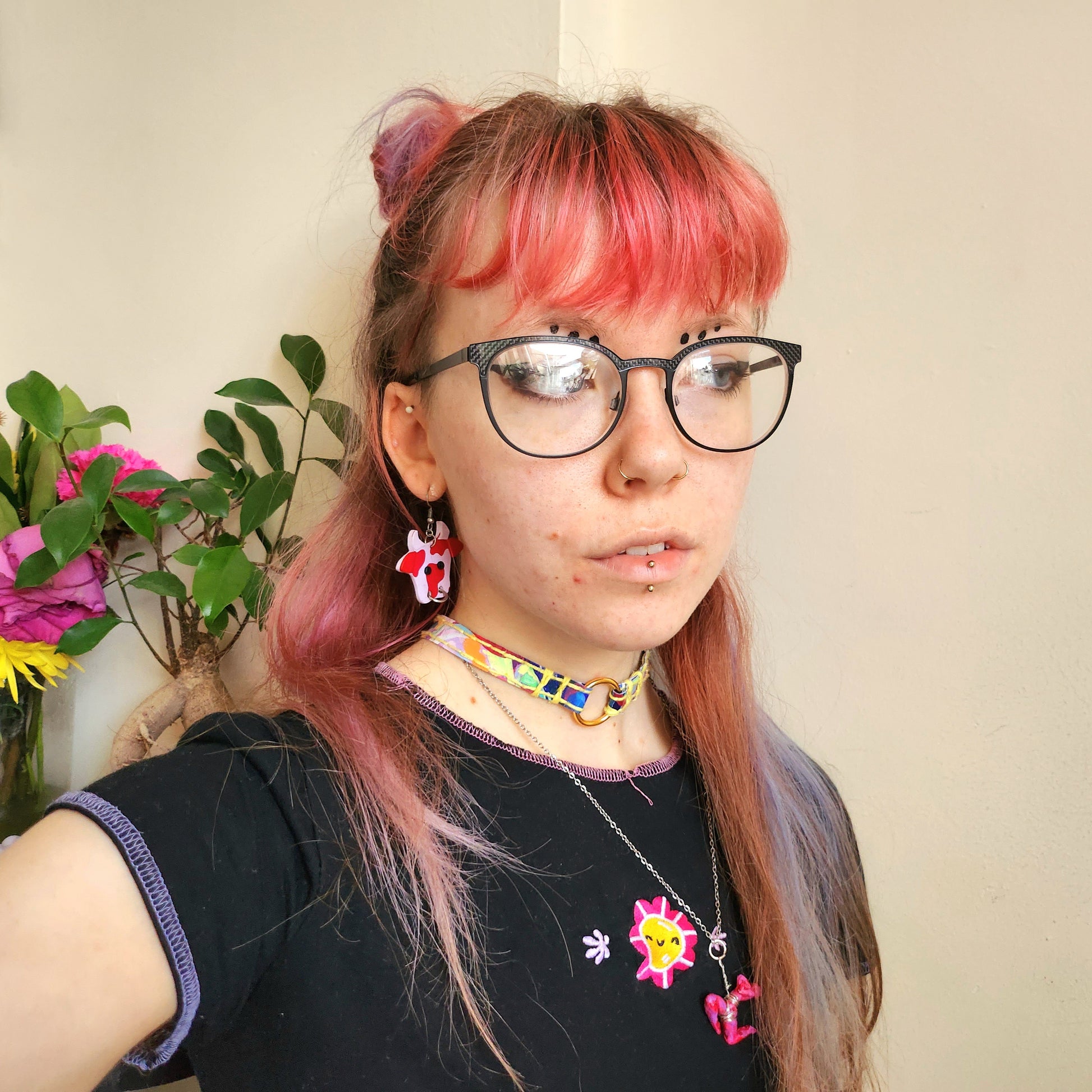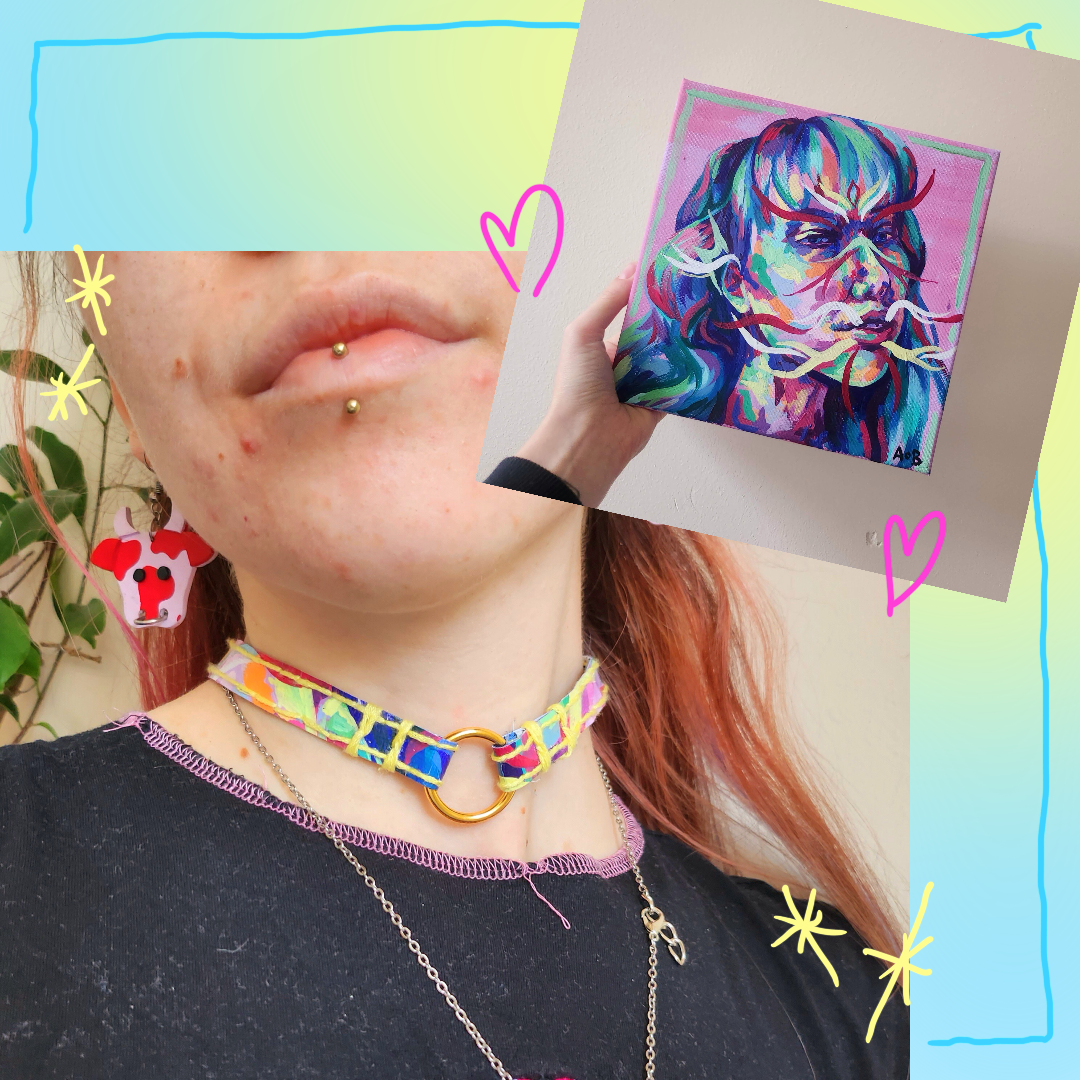 Hand stitched collar made from the canvas of an old artwork. Painting backed and sealed with fabric for strength, then hand stitched together.
